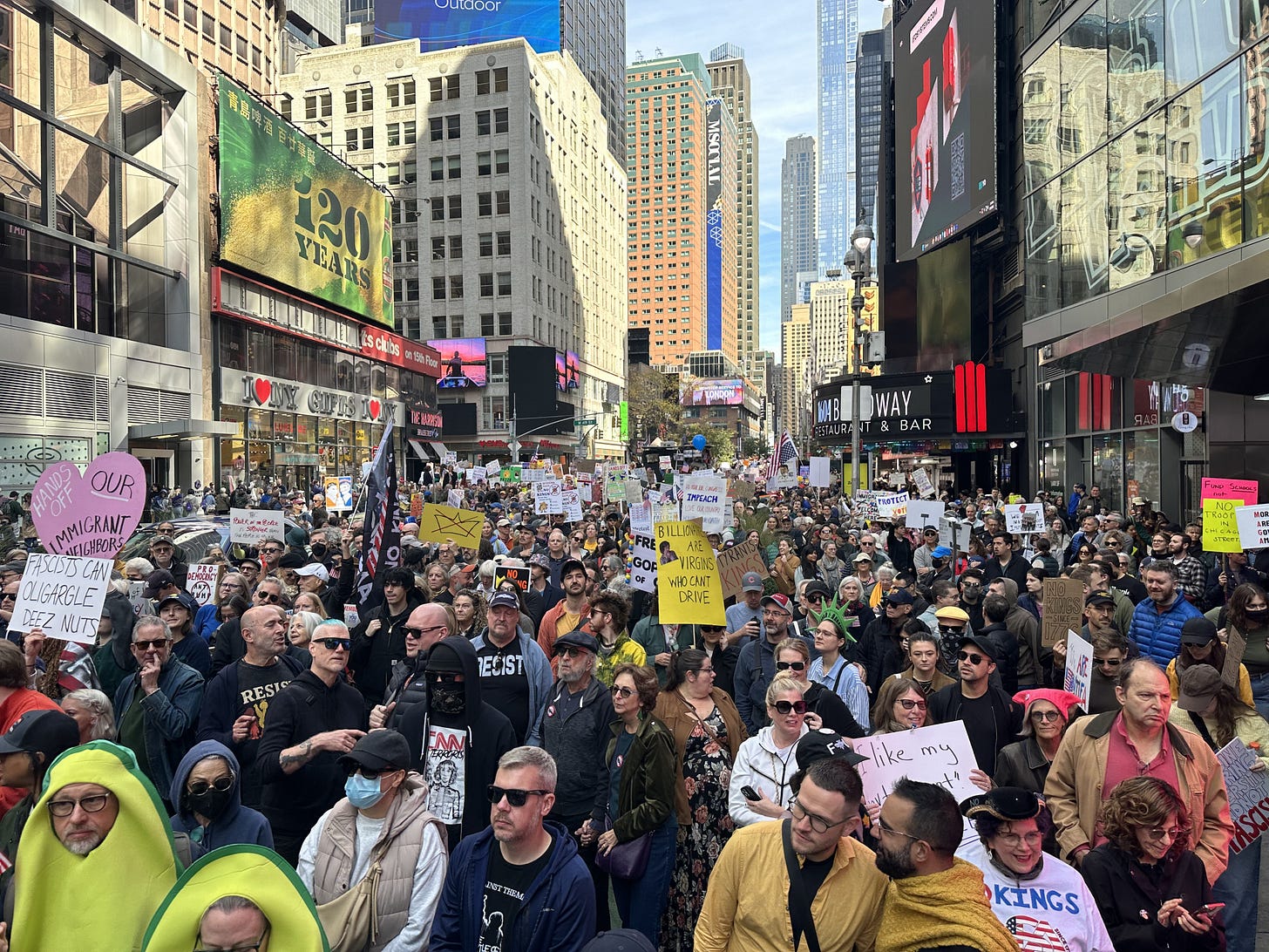 My associate producer, Charlotte Albrecht, attended the NYC protest in Times Square, where over 350,000 people gathered and marched 33 blocks to Union Square. Teenagers, parents pushing strollers, immigrant workers, union members, activists — whether draped in an American flag or decked out in a keffiyeh, toting a cardboard sign or wielding a glossy print out, waddling around in an inflatable unicorn or sporting a “Zohran for NYC” t-shirt — a mass of people pouring down 7th Avenue, to the tune of tubas and tambourines, a thousand cacophonous chants about every issue under the sun.